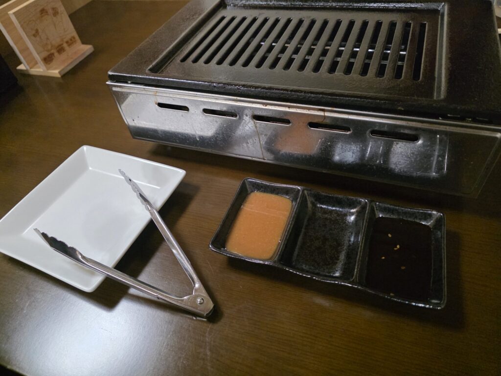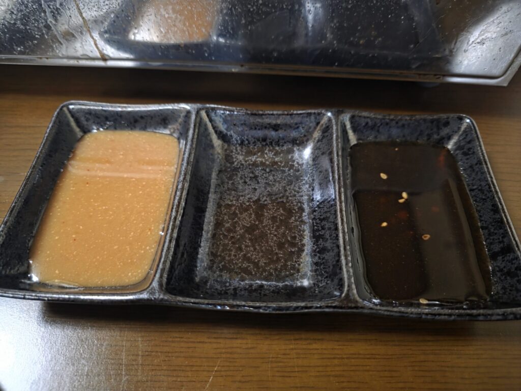 タレが2種類。右の黒っぽいものが一般的なタレでしょうか、甘みのあるタレでした。左のものは色は変わっていますが、味はよかったです。お肉にあわせるとすごく美味しい!