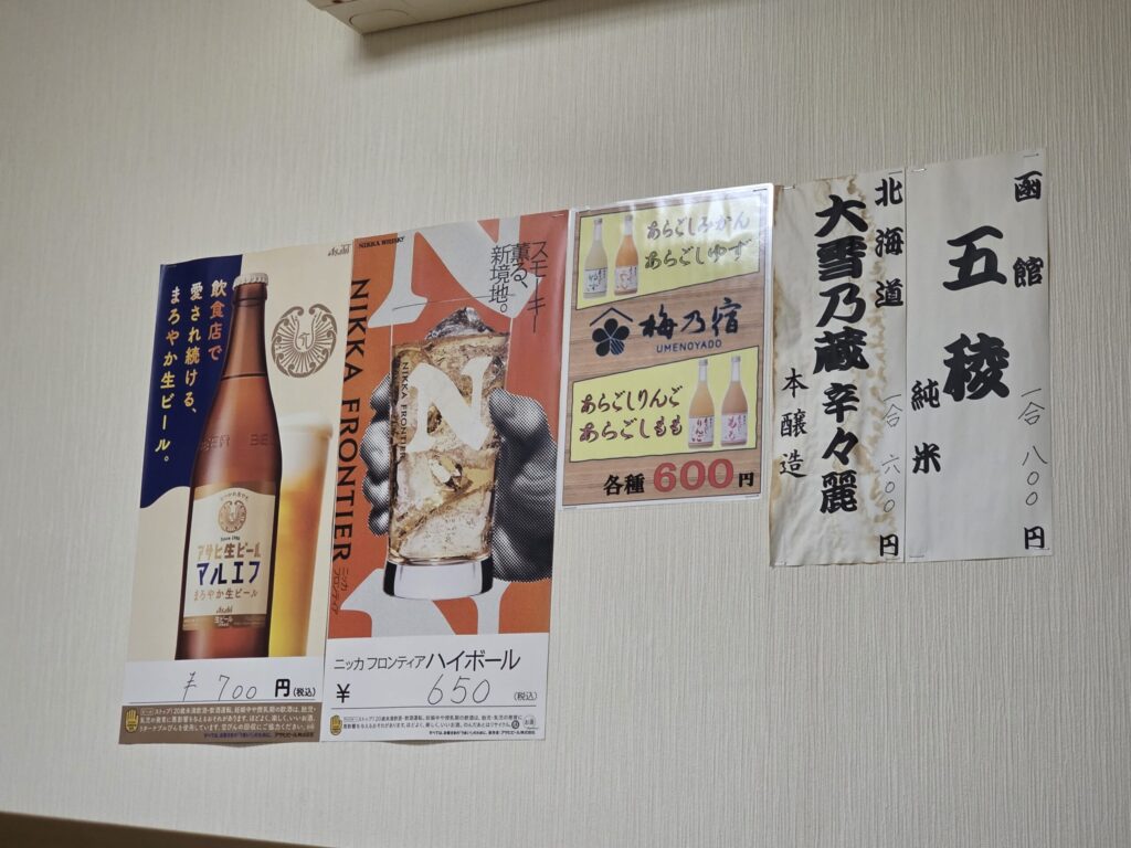 壁にはお酒の掲示が。日本酒は大雪の蔵と五稜。