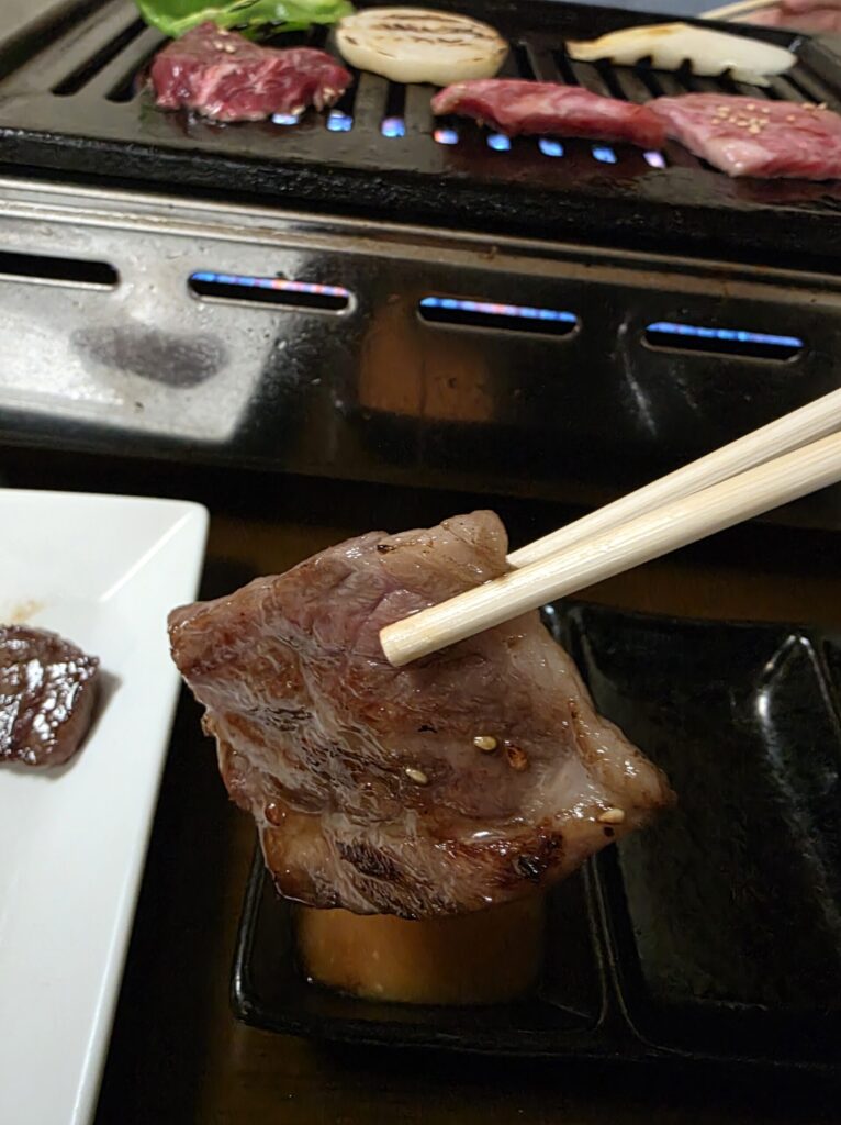 タレをつけて、頂きます!肉のお写真を見てもわかるように、サシが素晴らしくそのぶん脂も多いのですが、焼くといい感じに脂が落ちますし、いっちゃがさんのお肉は質がいいので脂も品がよく、全く苦になりません。