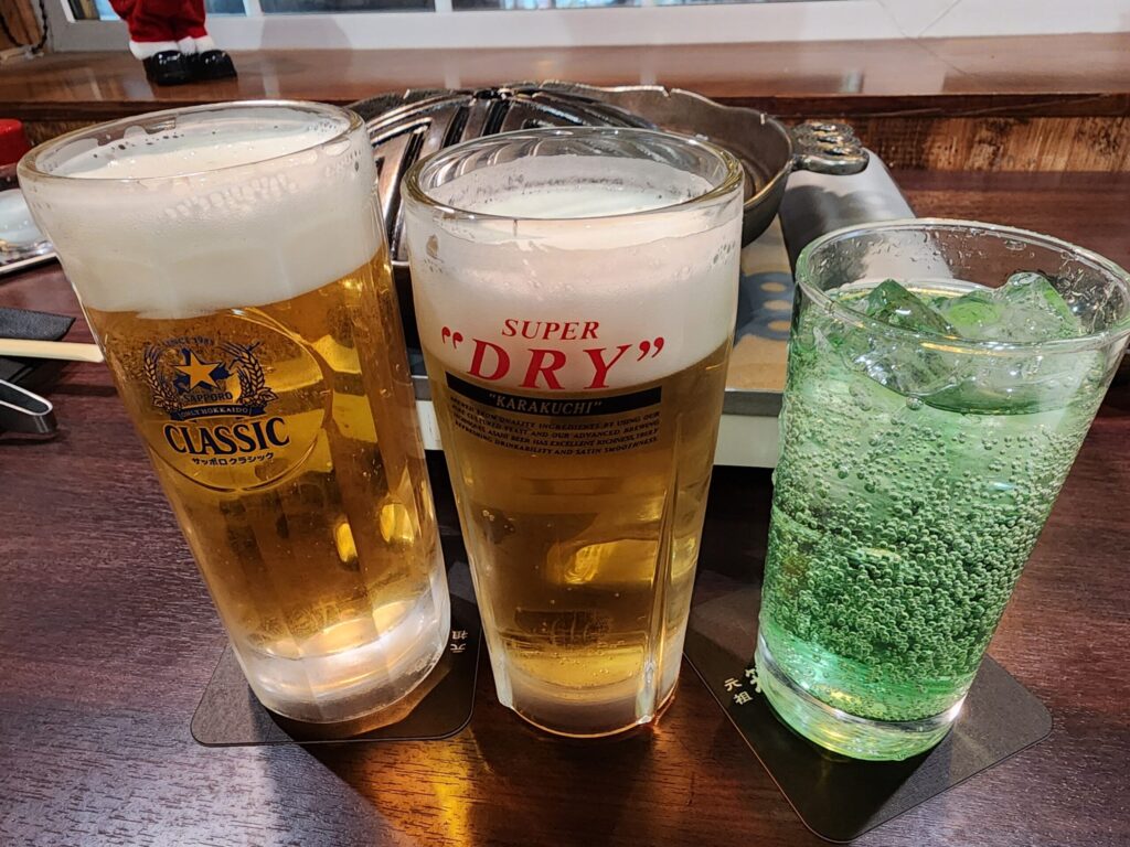まずはお飲み物をオーダー。ビールはクラシックとアサヒがありましたのでもちろん飲み比べるため両方オーダー。