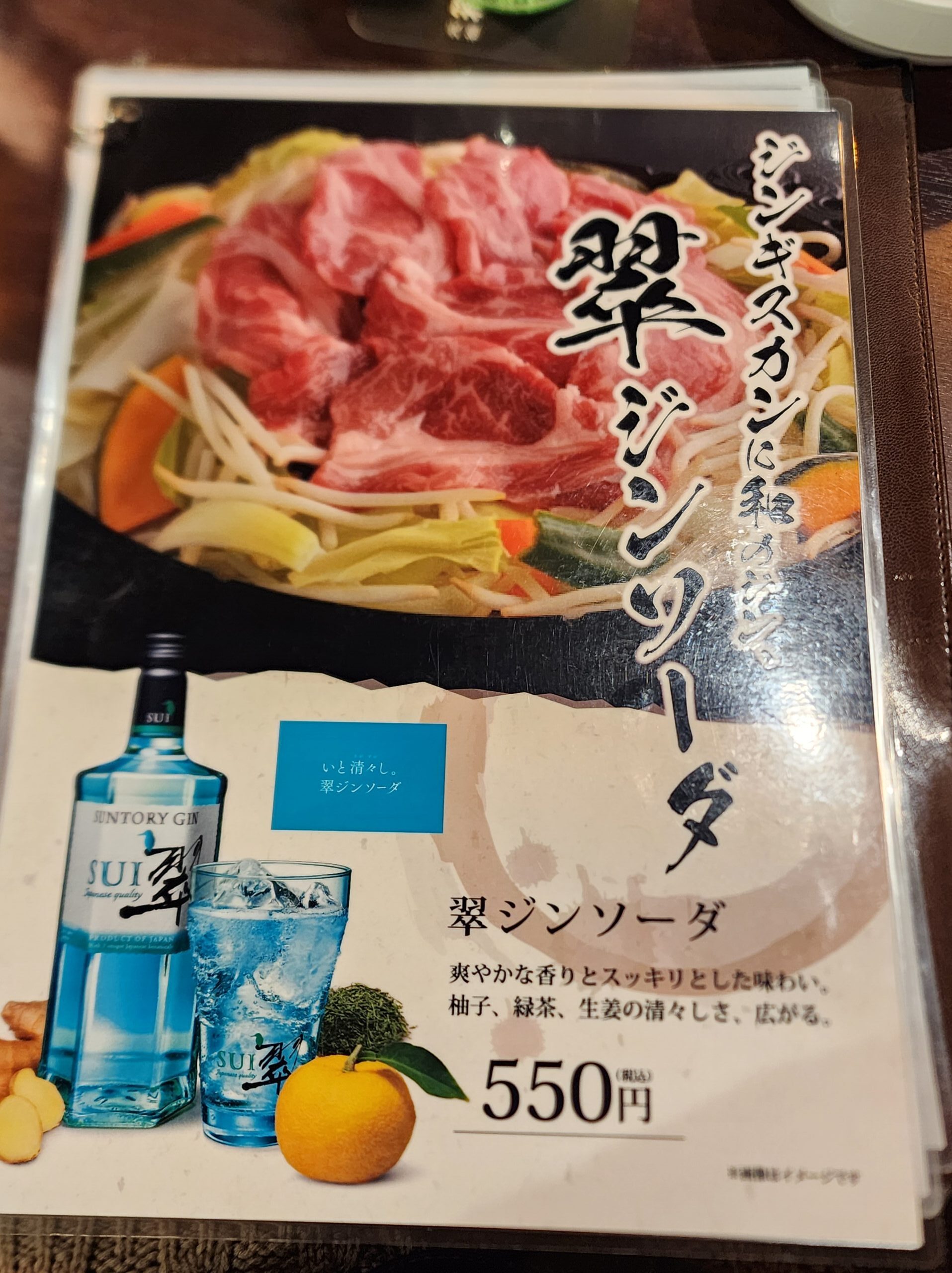 翠ジンソーダのラミネートも。確かに翠ジンはジンギスカンに合いそう。