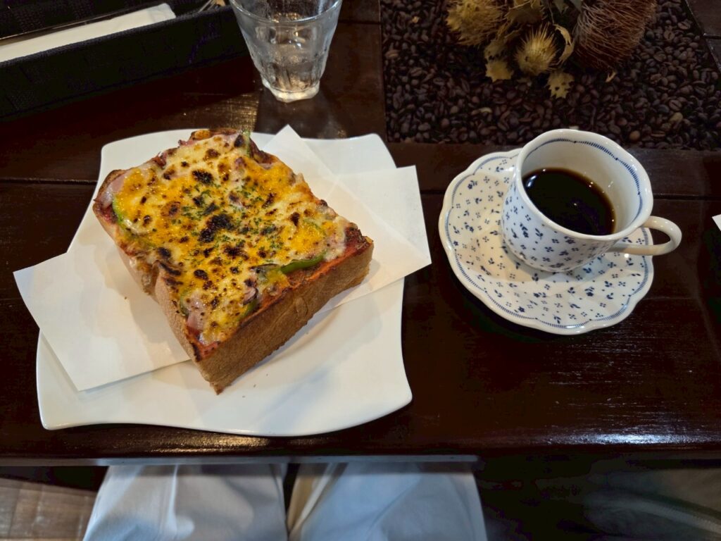 で、こちらがピザトースト。具沢山、チーズたっぷりにパンのこの厚み。控えめに言って最高です。